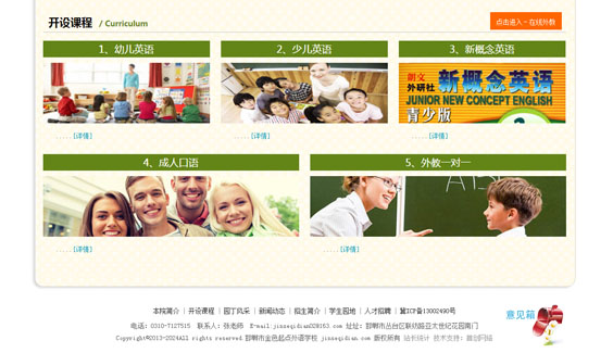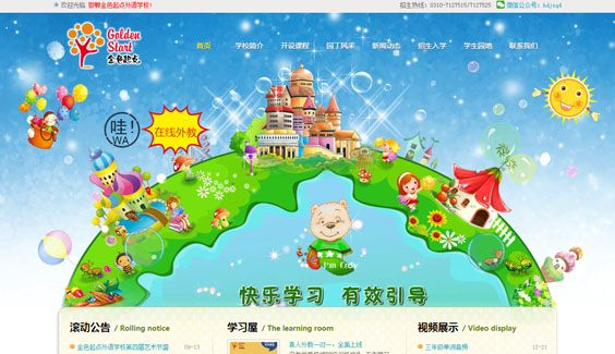 負責邯鄲市金色起點外語學校網(wǎng)站設(shè)計制作開發(fā)等網(wǎng)站建設(shè)服務(wù),金色起點是一所面向兒童的外語高級培訓學校,故網(wǎng)站設(shè)計時注重活潑、可愛、時尚等特點,金色起點網(wǎng)站設(shè)計以藍色為主打系,黃色為輔助色系,采用先進的動態(tài)flash技術(shù)使整個網(wǎng)站生動、形象、活潑等,結(jié)合學校的特點,以黃色為點輟,襯托年輕、成長、可愛的的學習畫卷。