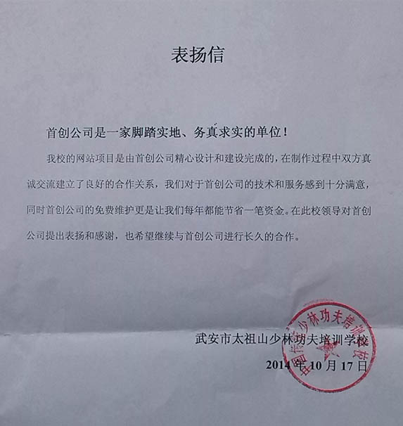 日前,我公司收到中國(guó)傳統(tǒng)少林功夫培訓(xùn)學(xué)校的表?yè)P(yáng)信,客戶對(duì)于網(wǎng)站建設(shè)和服務(wù)進(jìn)行了肯定和表?yè)P(yáng),在此感謝大家對(duì)我們工作的認(rèn)可,同時(shí)首創(chuàng)公司也會(huì)再接再厲,永遠(yuǎn)把用戶的利益放到第一位,以質(zhì)量和服務(wù)贏得客戶的口碑。